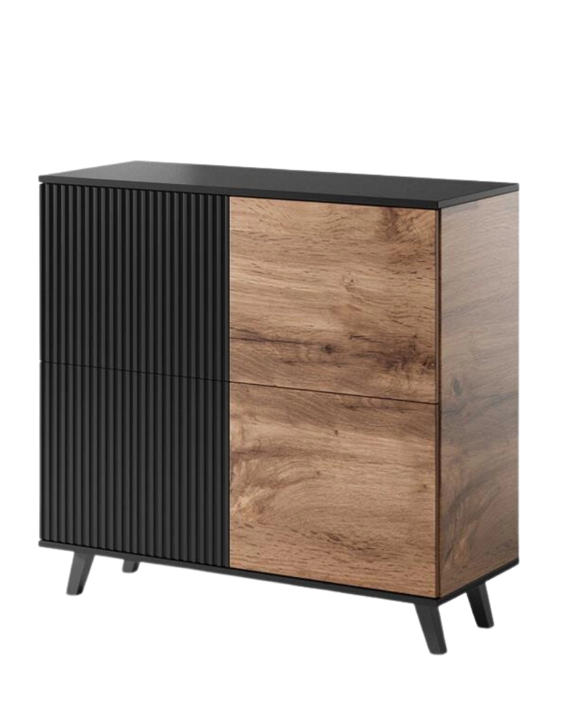 Comoda Random KM-2 - o comodă modernă cu sertare pe suporturi din plastic. Fabricată din PAL din lemn de stejar cu față din MDF negru cu suprafață ruginită (frezată).