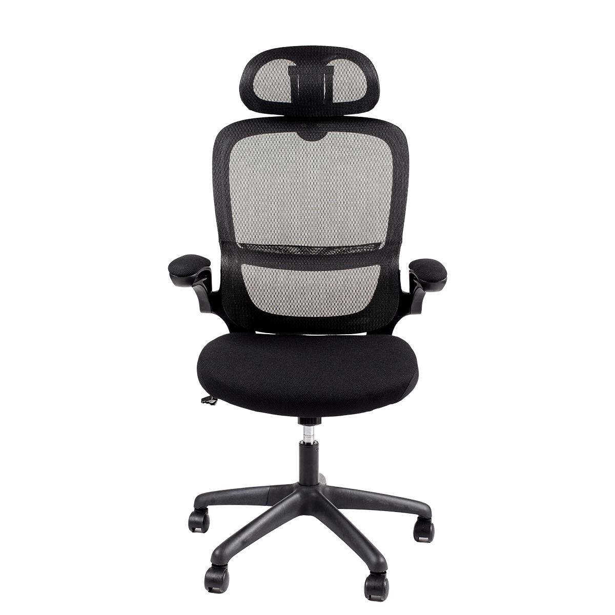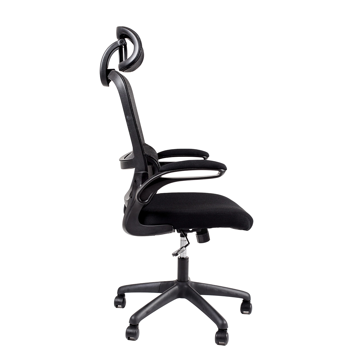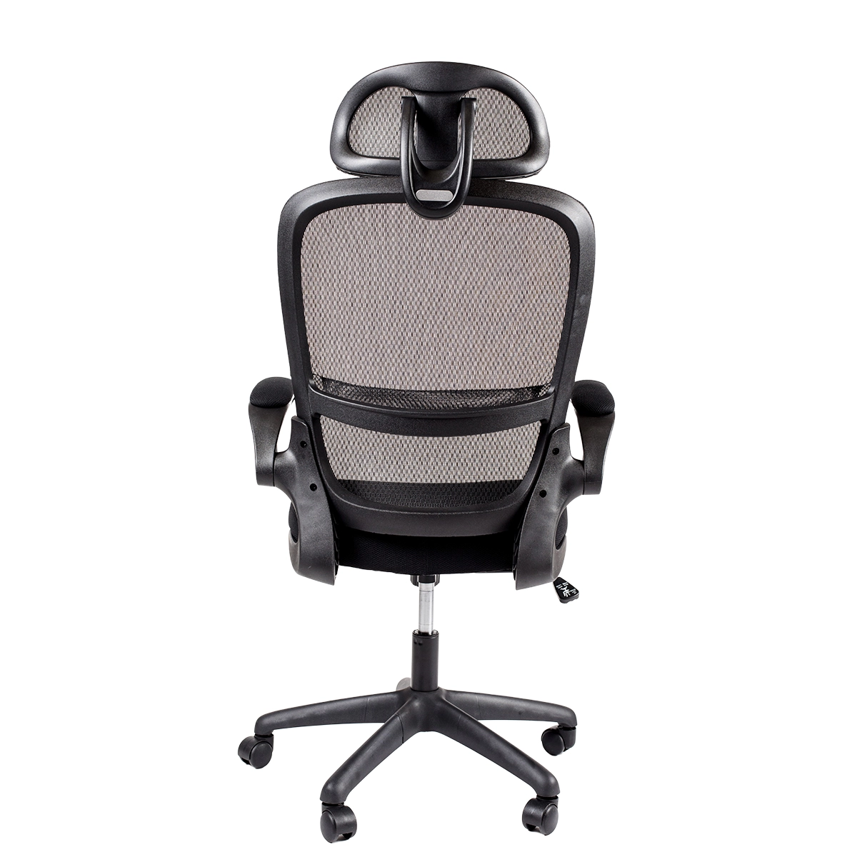 - Spătar înalt ergonomic cu suport lombar, tapețat cu plasă întărită cu fibră de sticlă.