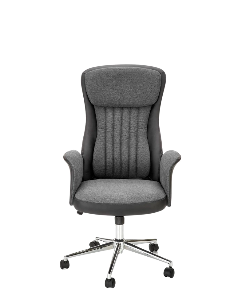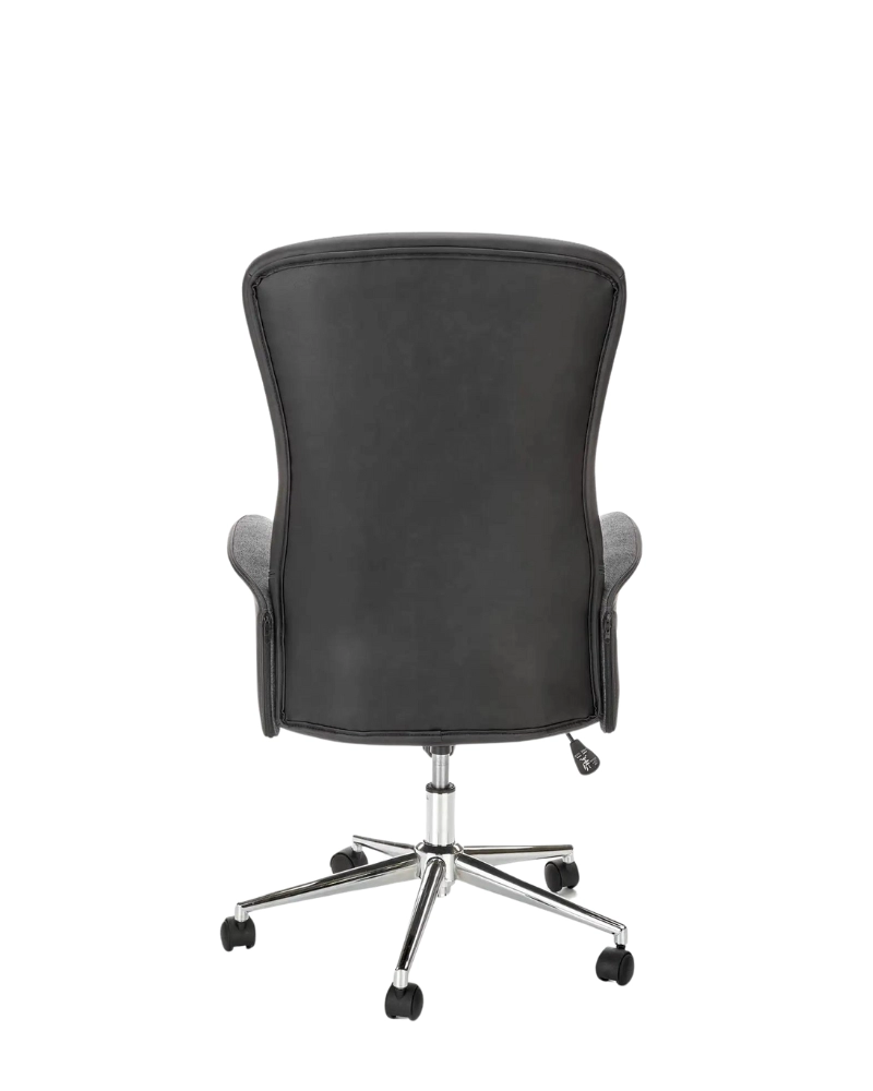 Designul fotoliului include un cadru transversal cu roți de transport, un scaun tapițat cu spătar înalt, tapițat în piele ecologică neagră și țesătură de culoare grafit, precum și cotiere.