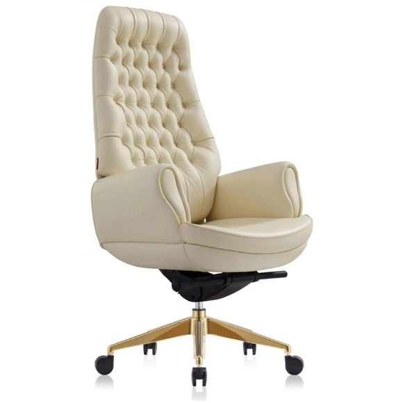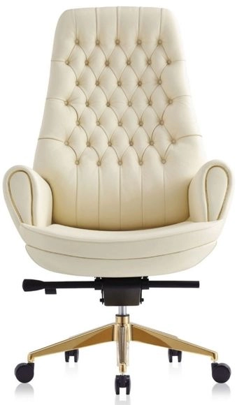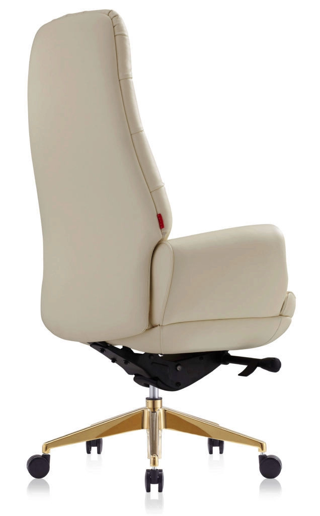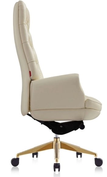 Spătarul trapezoidal este înfrumusețat în tehnica cusăturii de cărămidă. Caracterul aristocratic al fotoliului este accentuat de nuanța aurie a stâlpului de susținere. Culoarea metalului prețios este, de asemenea, dublată pe mulurile montate la capetele cotierelor și ale spătarului. Spătarul, șezutul și brațele mari tapițate sunt tapițate în piele de lux. Materialul natural este rezistent, are o senzație excelentă la atingere și este ușor de întreținut.