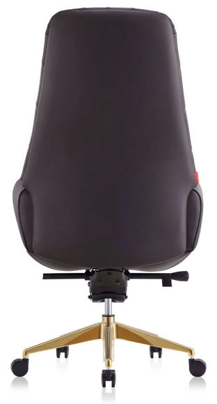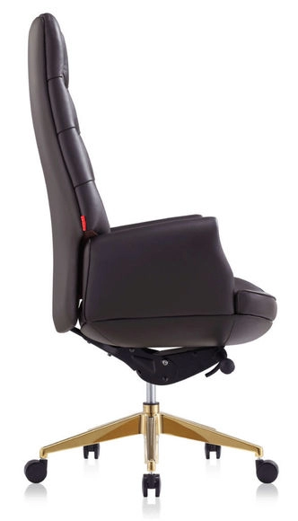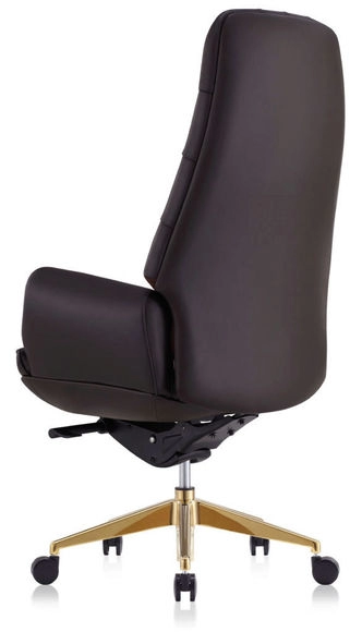 Spătarul trapezoidal este înfrumusețat în tehnica cusăturii de cărămidă. Caracterul aristocratic al fotoliului este accentuat de nuanța aurie a stâlpului de susținere. Culoarea metalului prețios este, de asemenea, dublată pe mulurile montate la capetele cotierelor și ale spătarului. Spătarul, șezutul și brațele mari tapițate sunt tapițate în piele de lux. Materialul natural este rezistent, are o senzație excelentă la atingere și este ușor de întreținut.