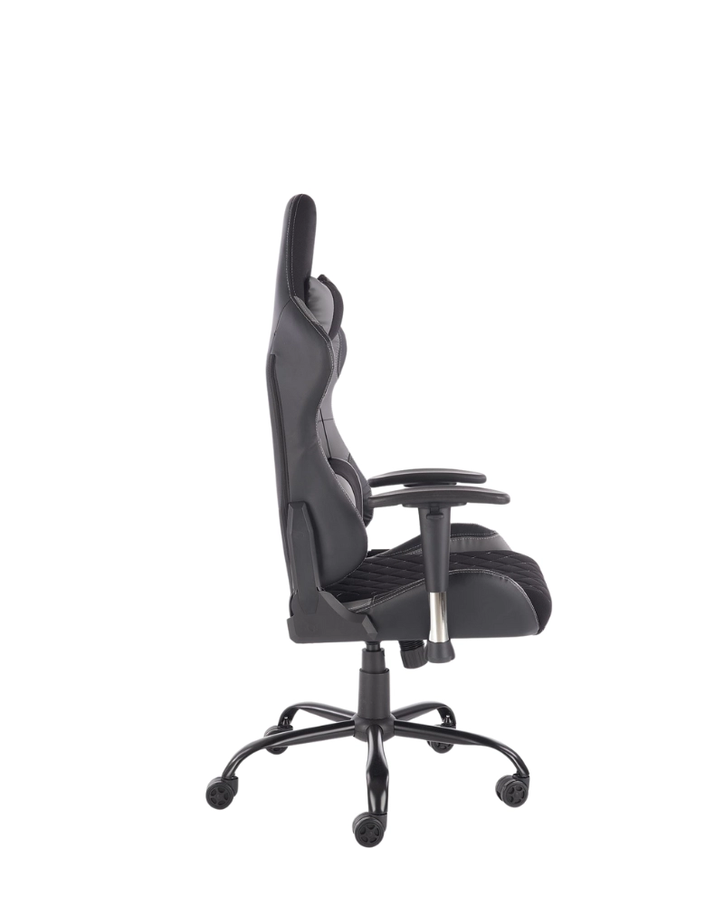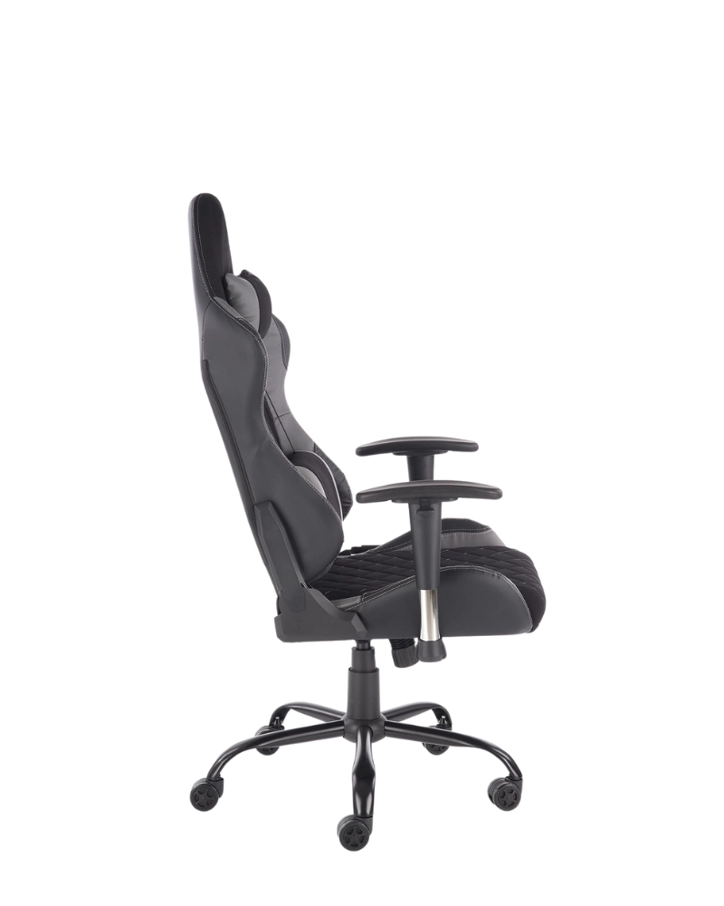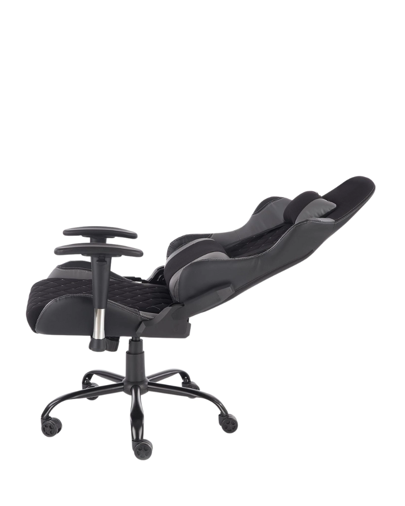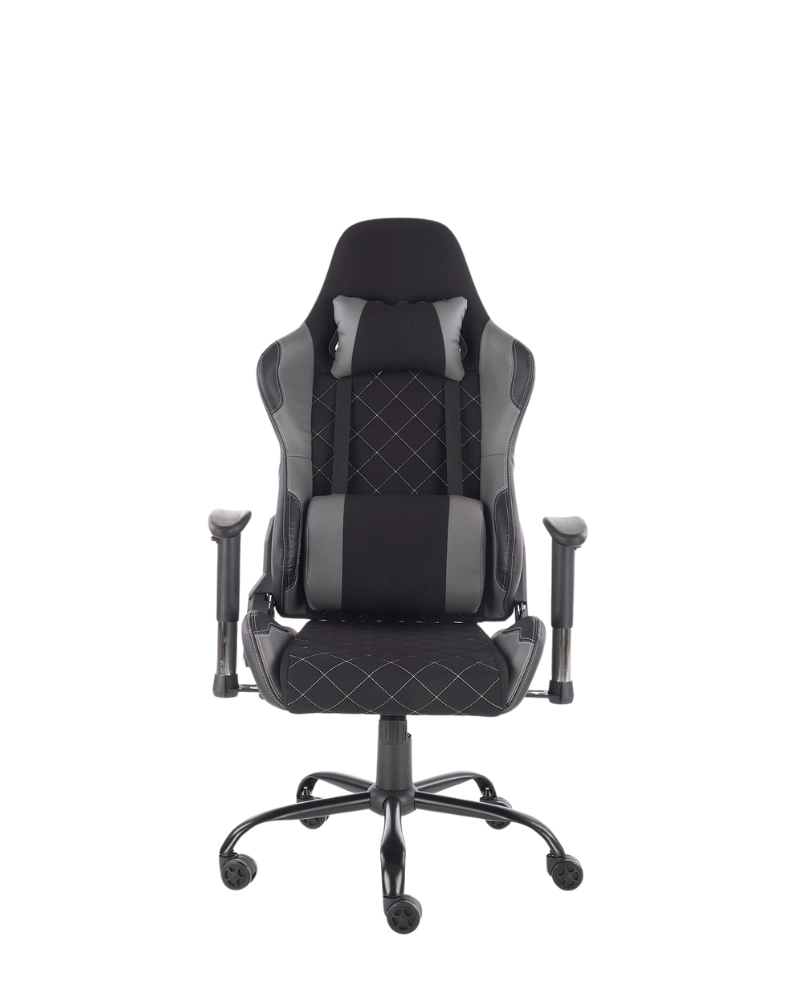 Șezutul confortabil și spătarul ergonomic sunt tapețate cu stofă de culoare neagră cu decor din piele eco de culoare gri. Un confort suplimentar oferă pernele pentru coloana lombară și a coloanei cervicale.