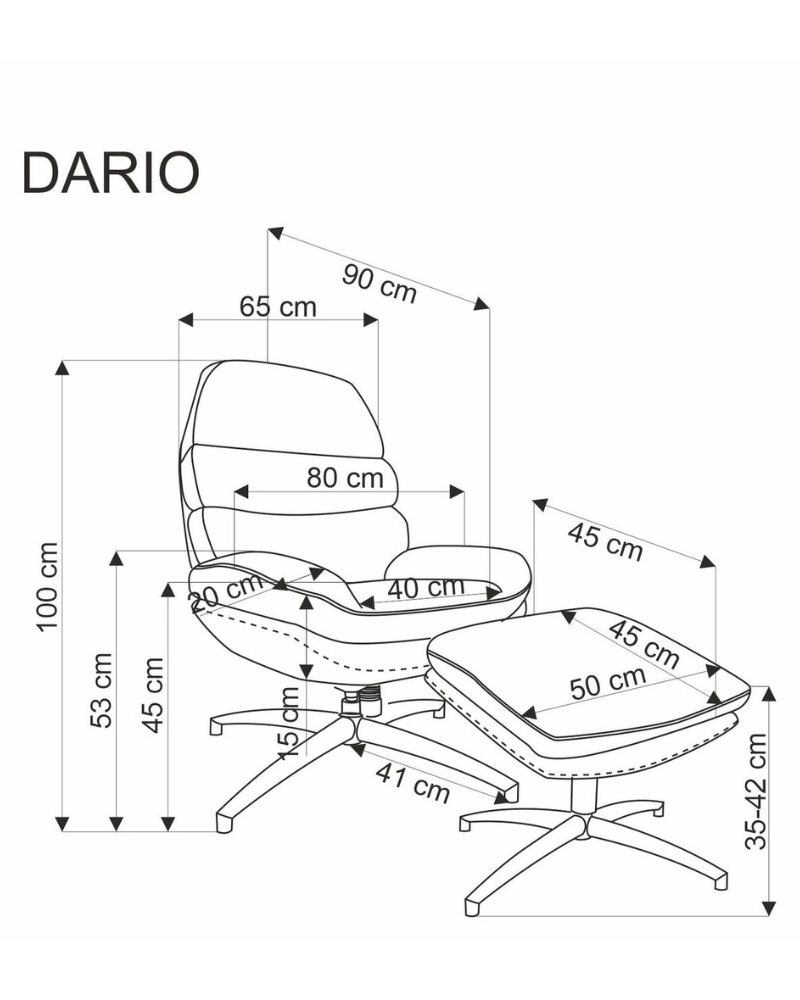 Fotoliul DARIO este conceput pentru a vă oferi momente de relaxare reală după o zi încărcată la serviciu. Dimensiunile sale de 80/90/100/45 cm și un suport confortabil pentru picioare de 50/45/42 cm vă permit să vă relaxați complet și să vă bucurați de confort.