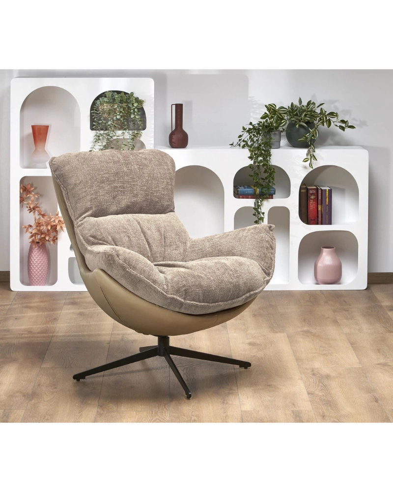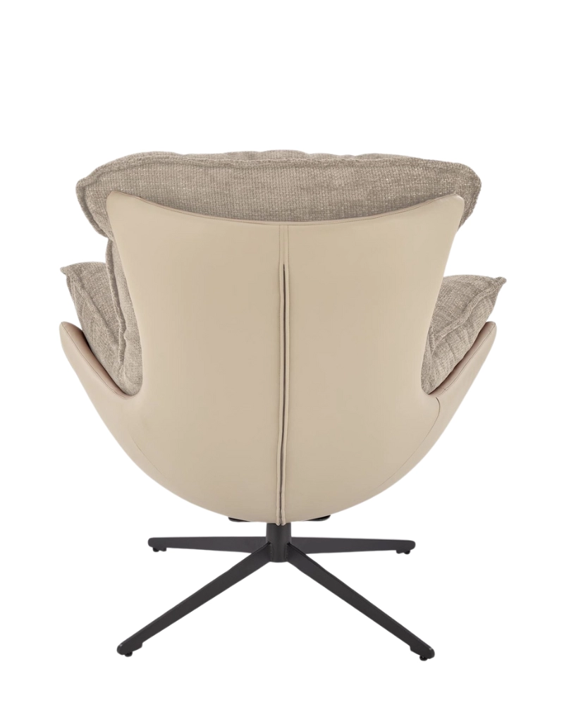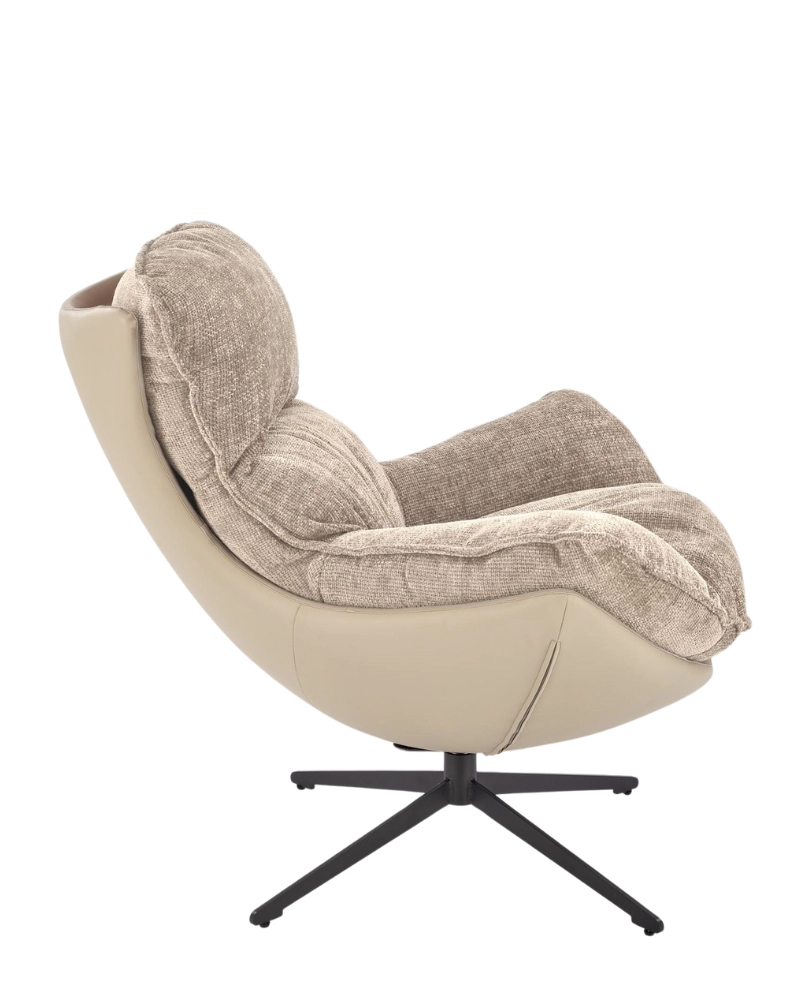 Cadrul metalic acoperit cu pulbere neagră oferă rezistență și fiabilitate. Tapițeria este realizată într-o combinație de piele ecologică și țesătură HAGA, care conferă fotoliului un aspect rafinat. Baza fotoliului este acoperită cu piele ecologică, iar partea moale cu țesătură, oferind confort și senzații tactile plăcute.