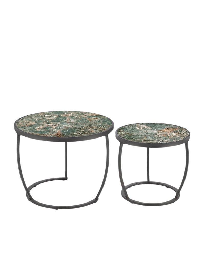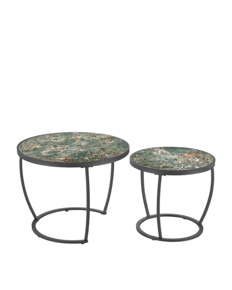 Gratuit pentru comenzile de peste 1000 lei.INES HALMAR este un set elegant de 2 măsuțe de cafea, model nou din 2024 pentru interioarele moderne. Designul fiecărei mese include un cadru din oțel de culoare neagră și un blat rotund cu efect de marmură verde/albă.