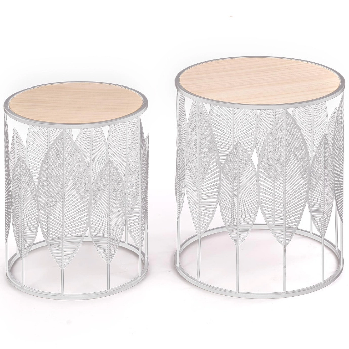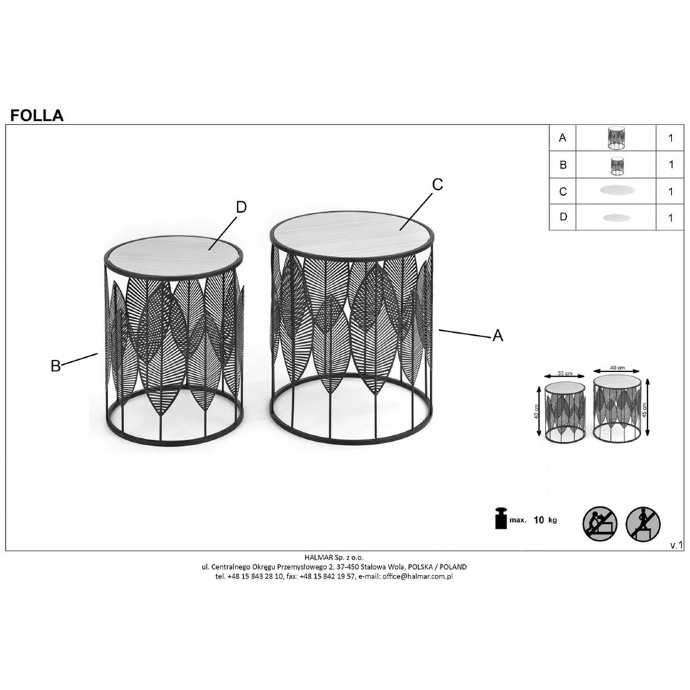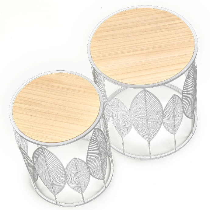 Setul de măsuțe de cafea FOLLA este un set de măsuțe de cafea traforate de la compania poloneză Halmar, format din două mese cu blat rotund din MDF laminat de culoare naturală. Picioarele sunt realizate din oțel vopsit.