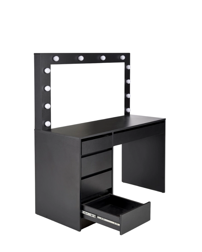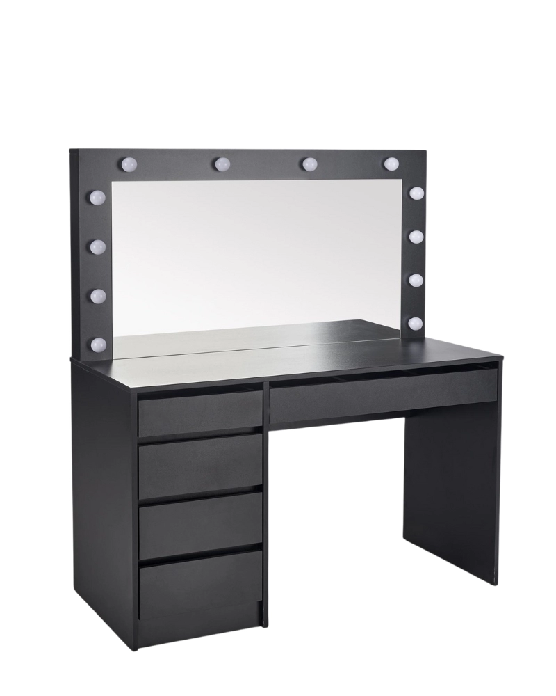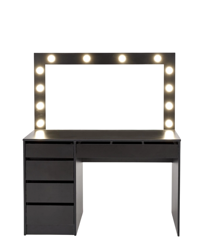 HOLLYWOOD XL dispune de un blat de masă din PAL cu o formă dreptunghiulară elegantă, precum și de cinci sertare convenabile pentru depozitarea diferitelor produse de înfrumusețare și îngrijire. În plus, această măsuță de toaletă dispune de o oglindă cu iluminare LED, ceea ce o face locul perfect pentru machiaj și îngrijirea pielii.