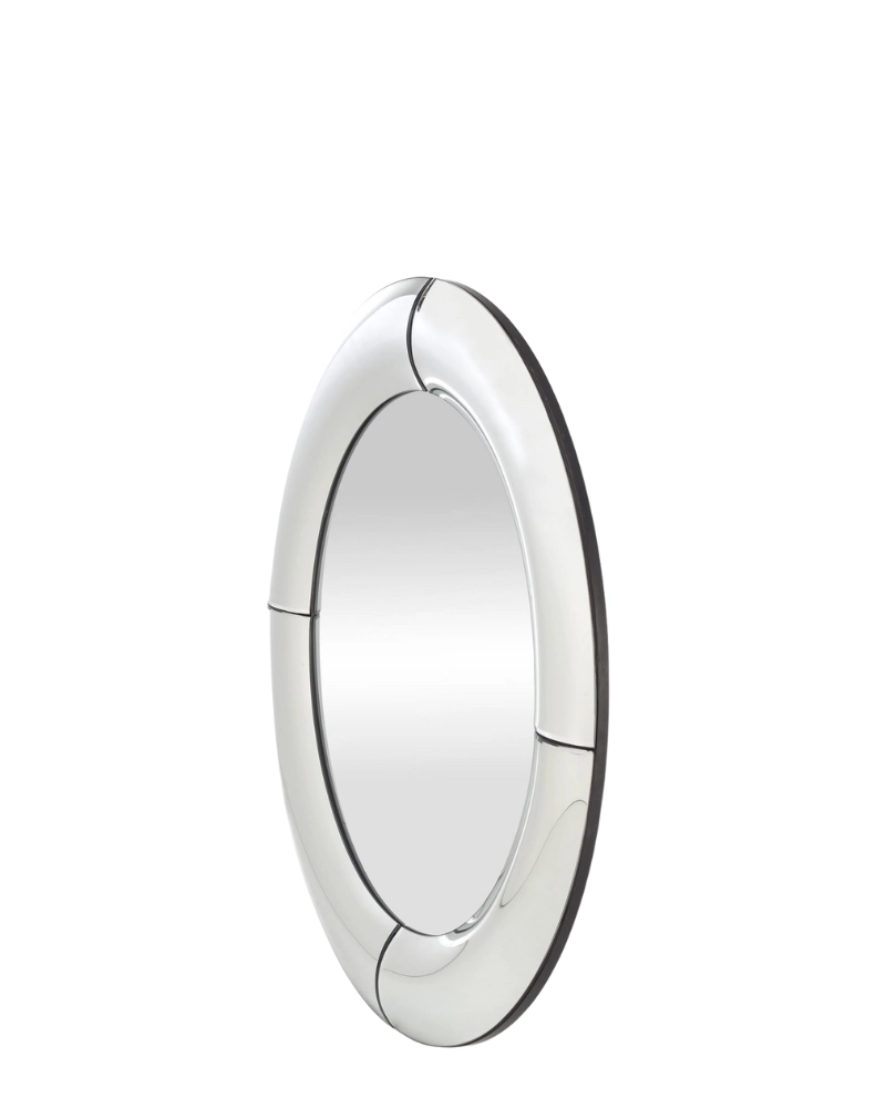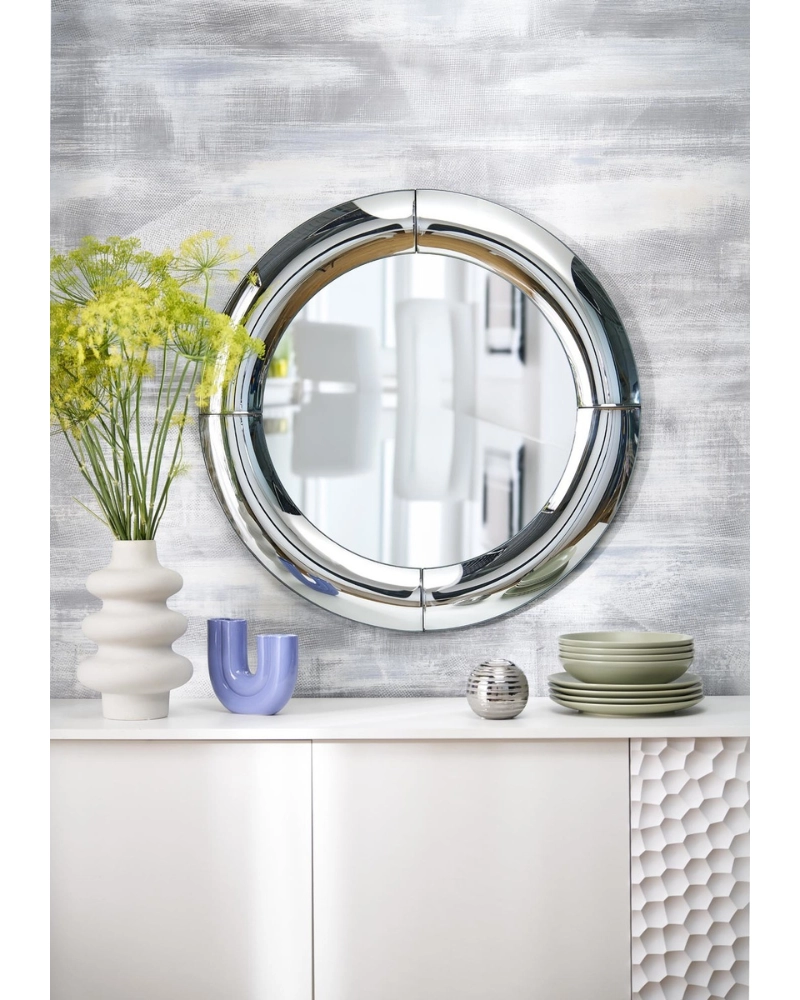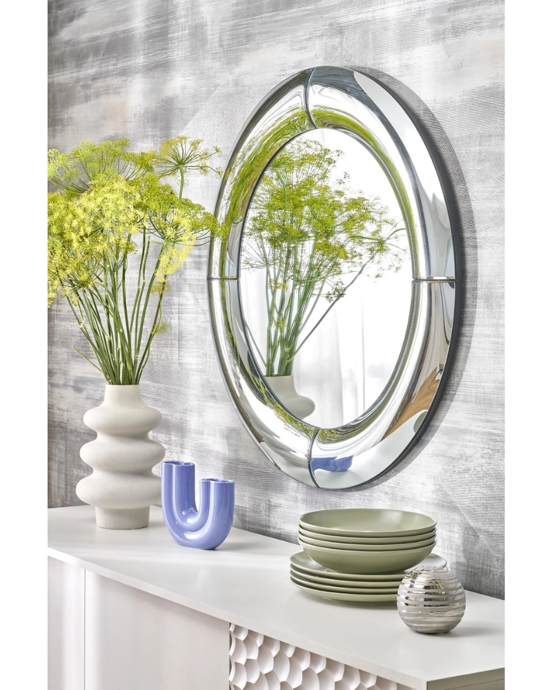 Oglinda de perete Moon de la fabrica poloneză Halmar — strălucire rafinată și profunzime vizuală a interiorului. Oglinda Moon în ramă argintie nu este doar un obiect funcțional, ci un accent luminos, capabil să transforme orice spațiu. Rama sa curbată din sticlă, cu o teșitură elegantă, subliniază rafinamentul formei și adaugă luminozitate și profunzime interiorului. Fixare orizontală și verticală – flexibilitate în amplasarea pe perete.