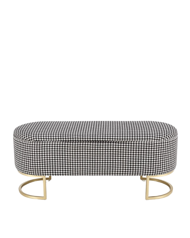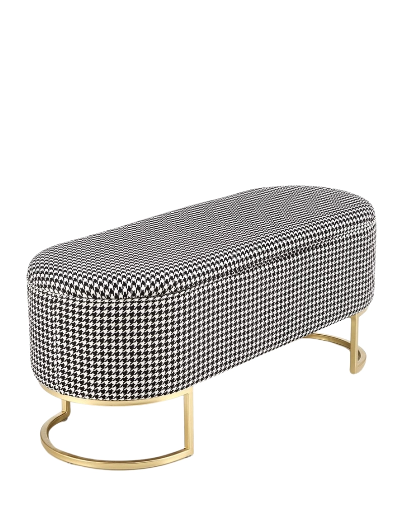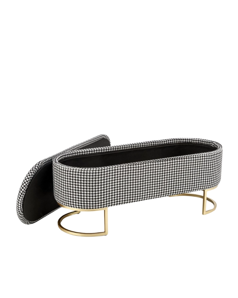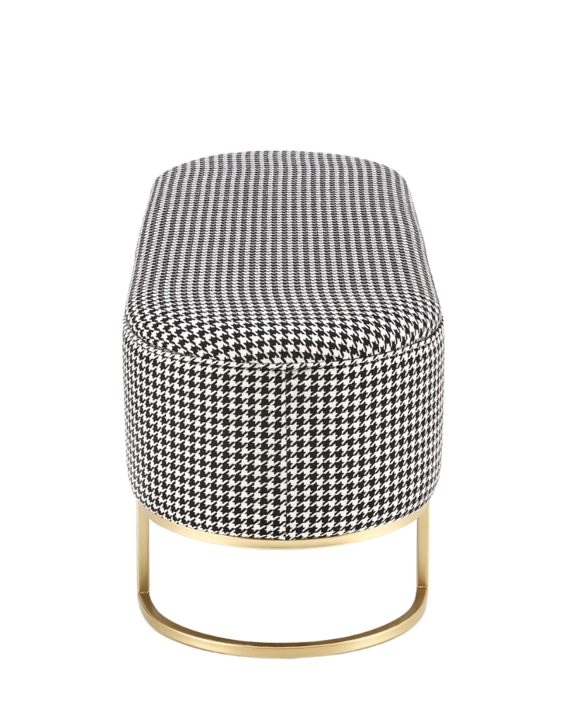 Banca HARMONY HALMAR este o noutate spectaculoasă care va fi un accesoriu demn de un interior modern. Designul său constă dintr-un cadru metalic de culoare aurie și un corp cu un recipient de depozitare. Suprafața corpului este tapițată cu țesătură cu imprimeu houndstooth alb și negru.
