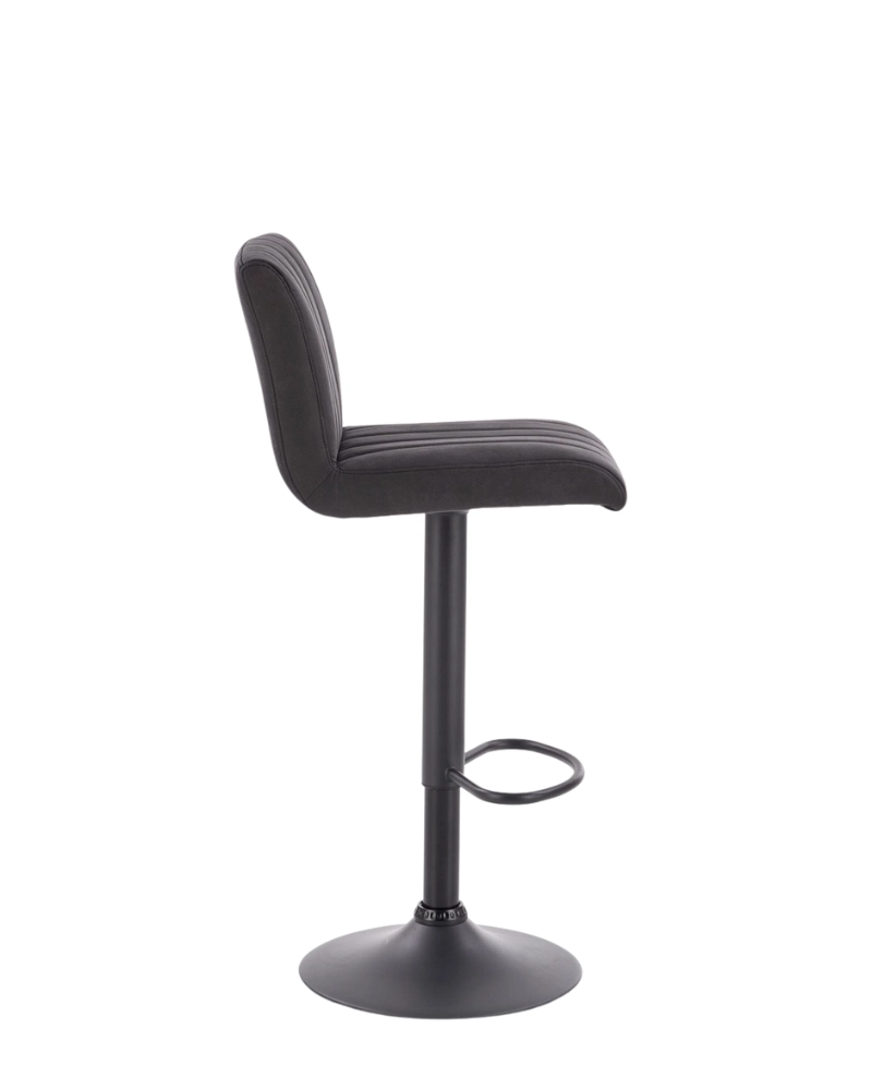 Scaunul de bar H-89 reglabil pe înalțime de la compania poloneză Halmar, este tapițat în piele eco - asemanatoare cu pielea întoarsă, de culoare gri închis. Spătarul și șezutul sunt decorate cu dungi verticale pe întreaga suprafață, ceea ce crește durabilitatea tapițeriei și accentuează formele geometrice ale scaunului.