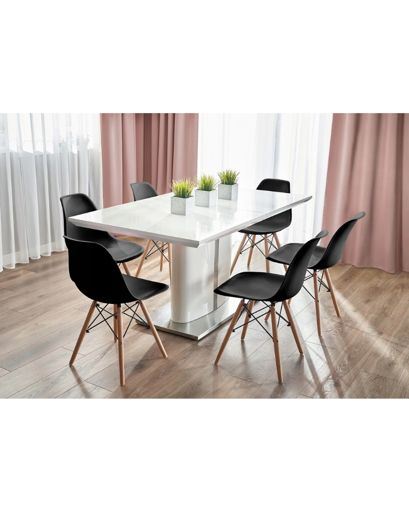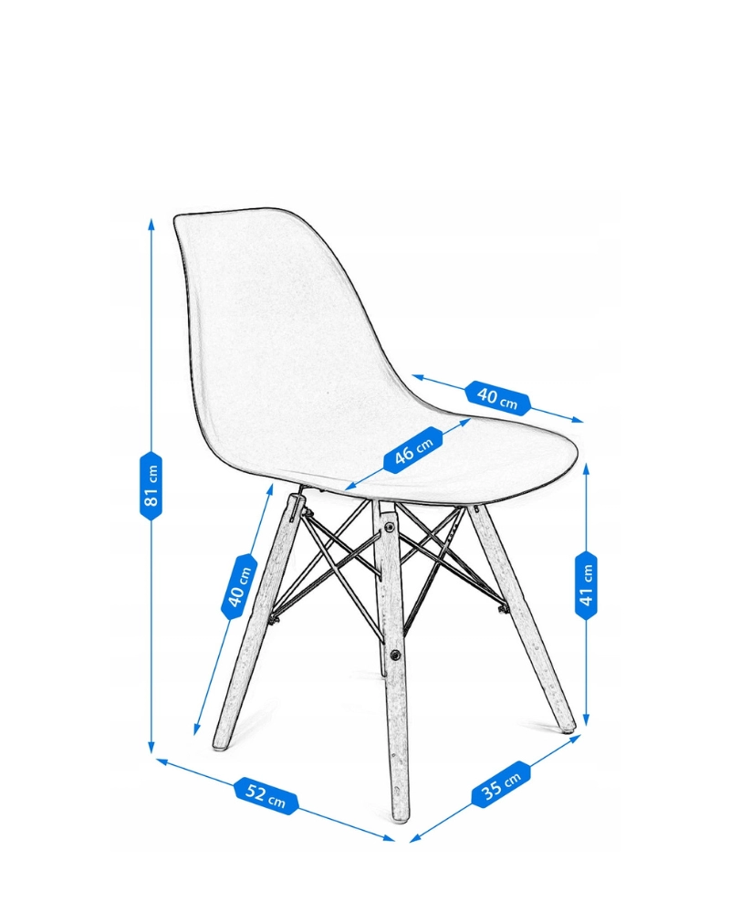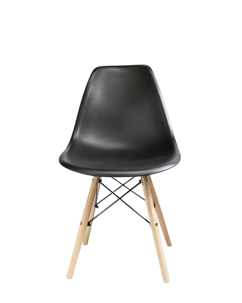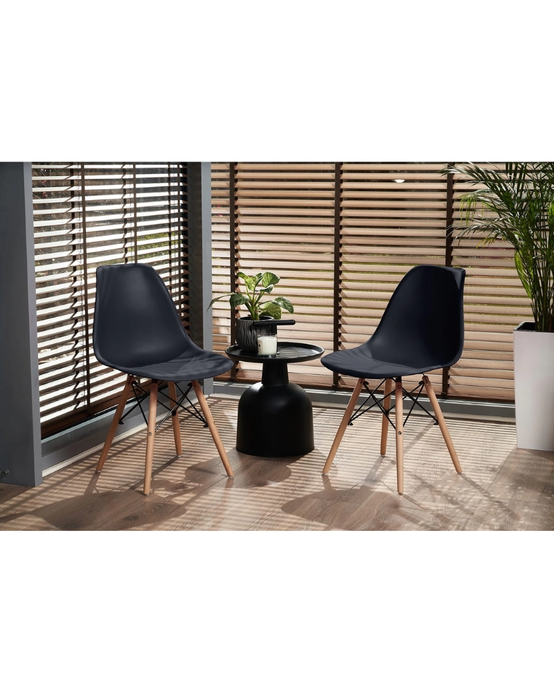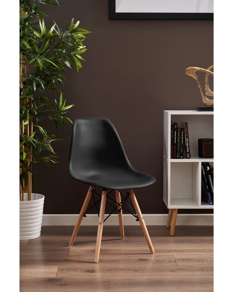 Șezutul este din polipropilenă perfect conturată, iar picioarele sunt realizate din lemn masiv natural de fag - oferind rezistență și stabilitate în timpul utilizării, în plus, îmbinările negre întăresc întregul cadru și sunt și decorative.