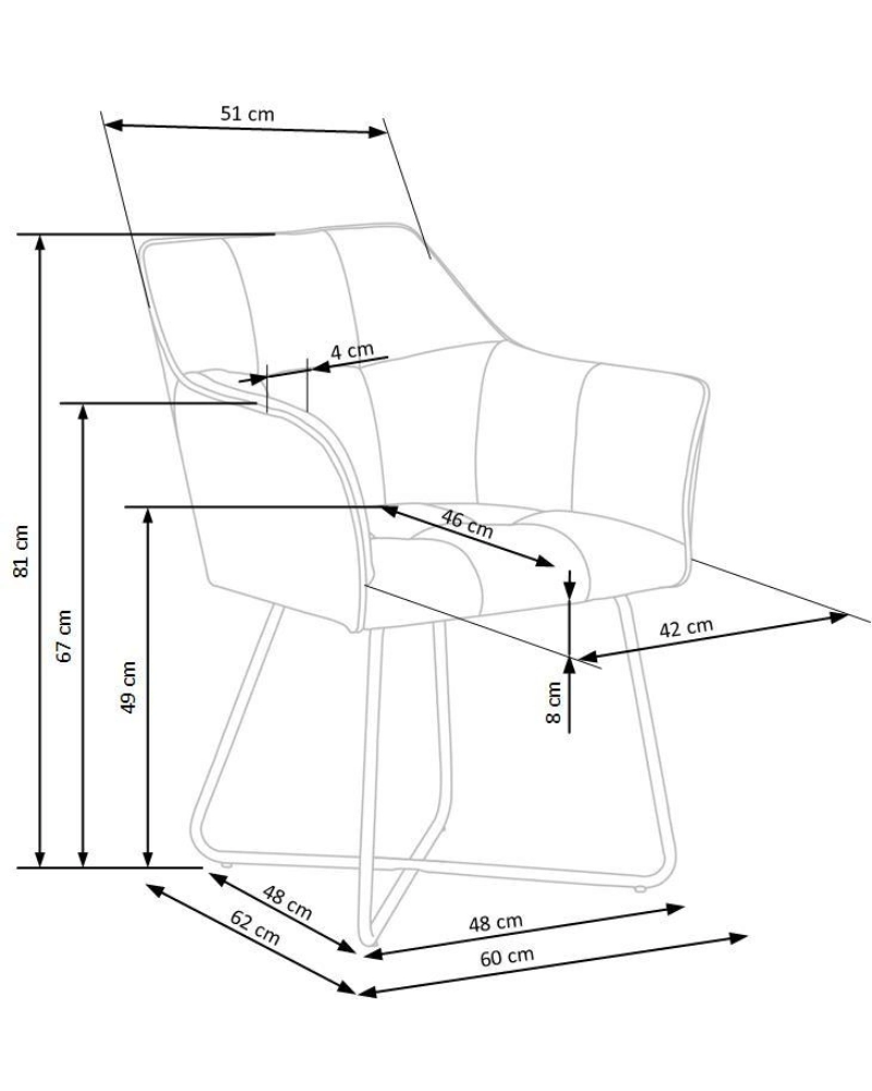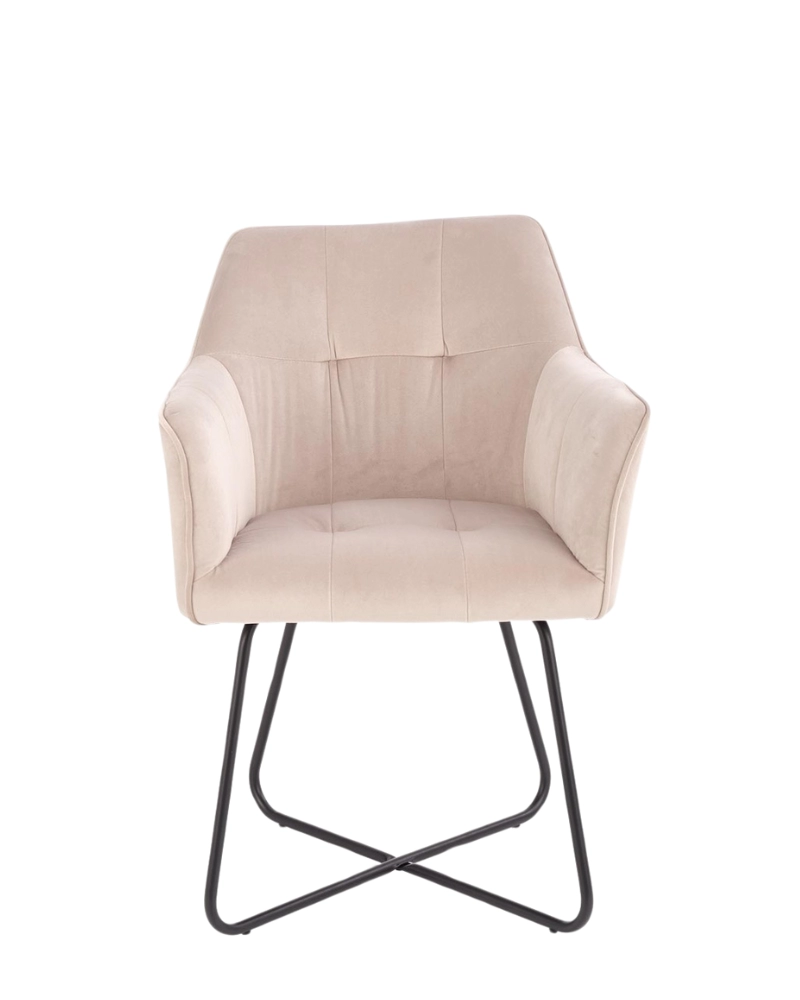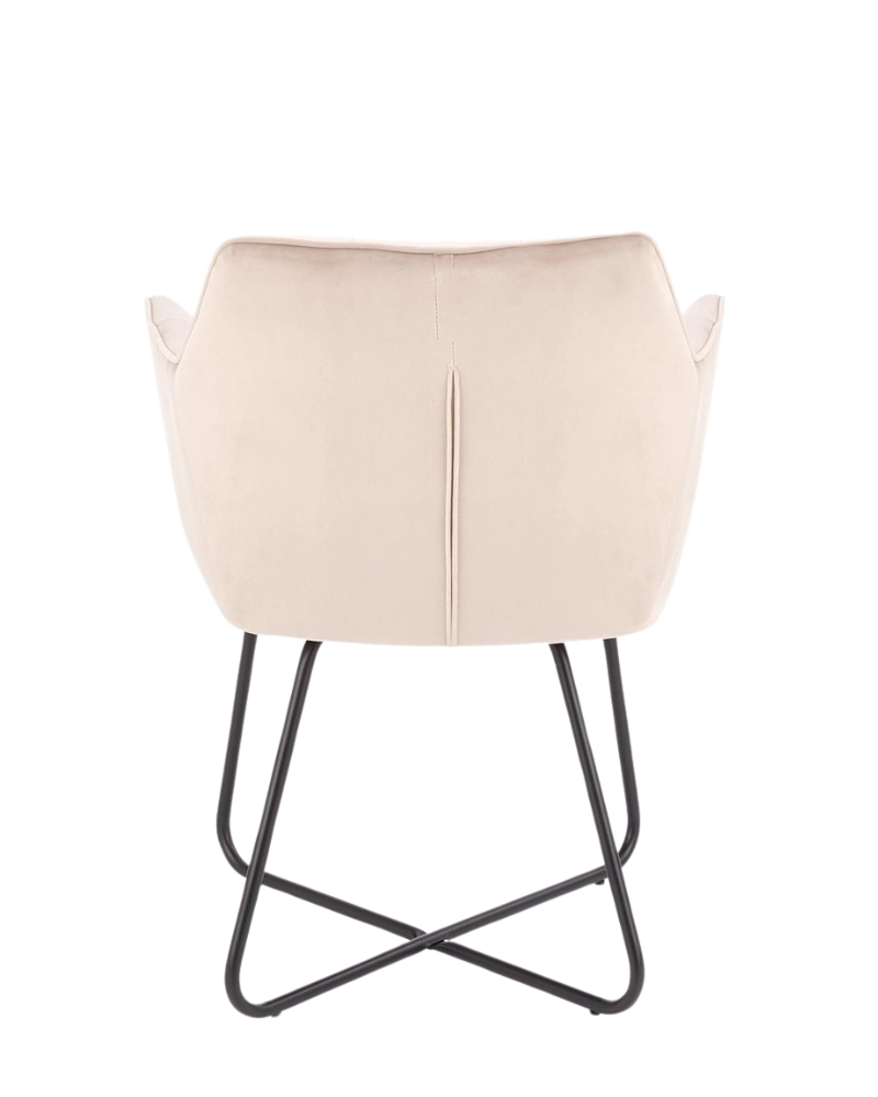 Scaunul este tapițat cu catifea, iar picioarele sunt din metal vopsit, cucrapodine din poliuretan care previn deteriorarea pardoselii.