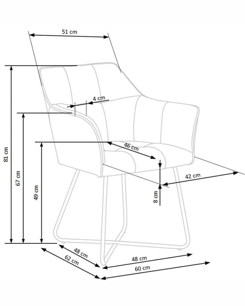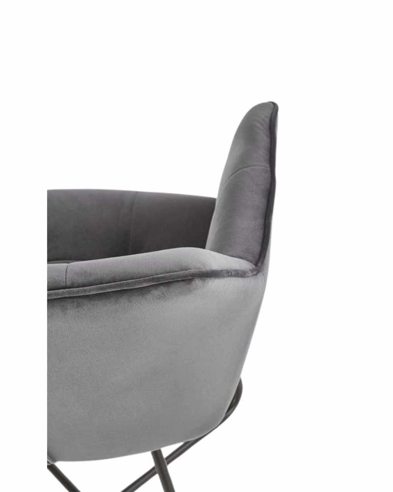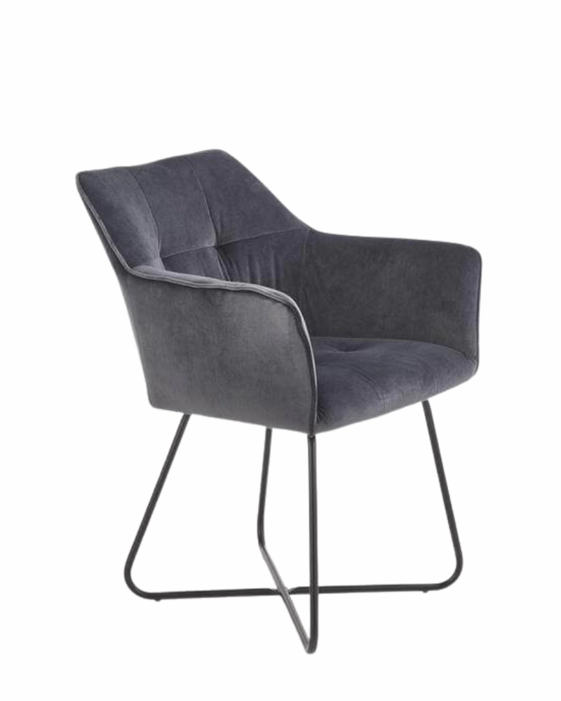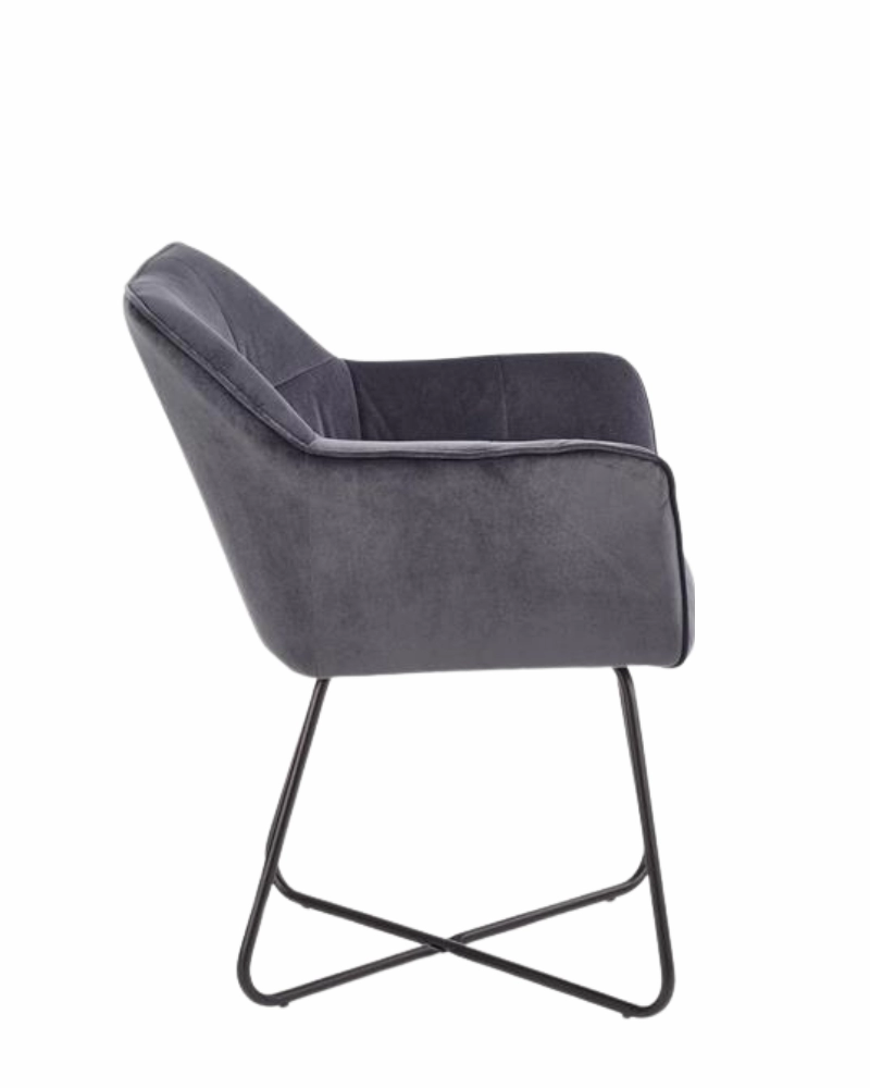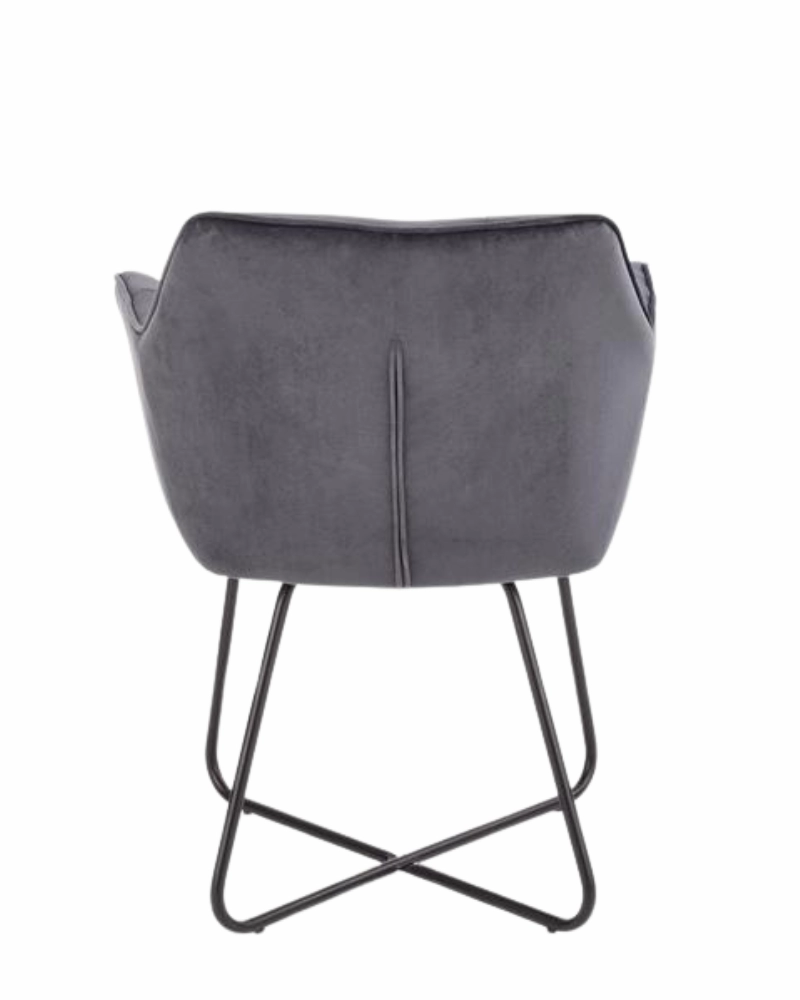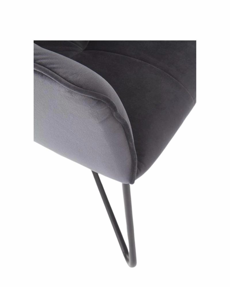 Scaunul este tapițat cu catifea, iar picioarele sunt din metal vopsit, cucrapodine din poliuretan care previn deteriorarea pardoselii.