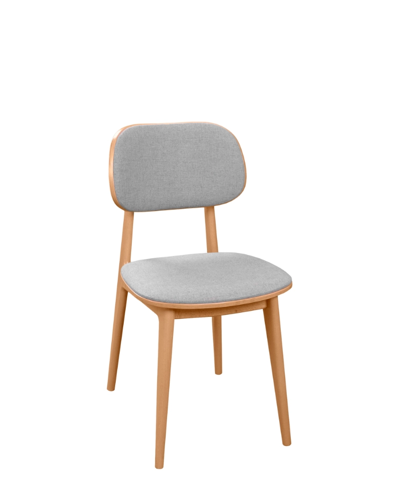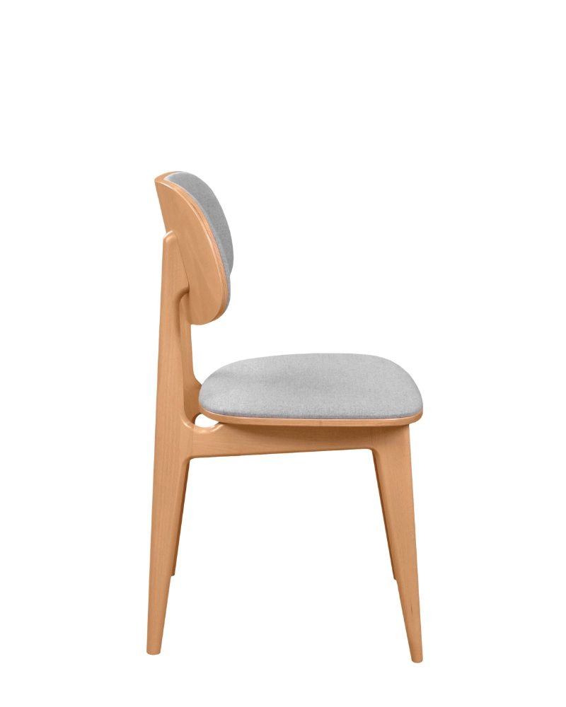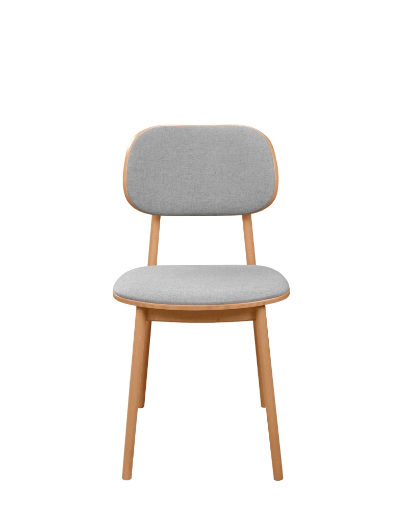 Șezutul și spătarul sunt tapițate cu o țesătură moale, de culoare gri deschis, care nu doar completează estetica, ci și asigură un confort sporit. Textura discretă a materialului adaugă profunzime și rafinament scaunului.