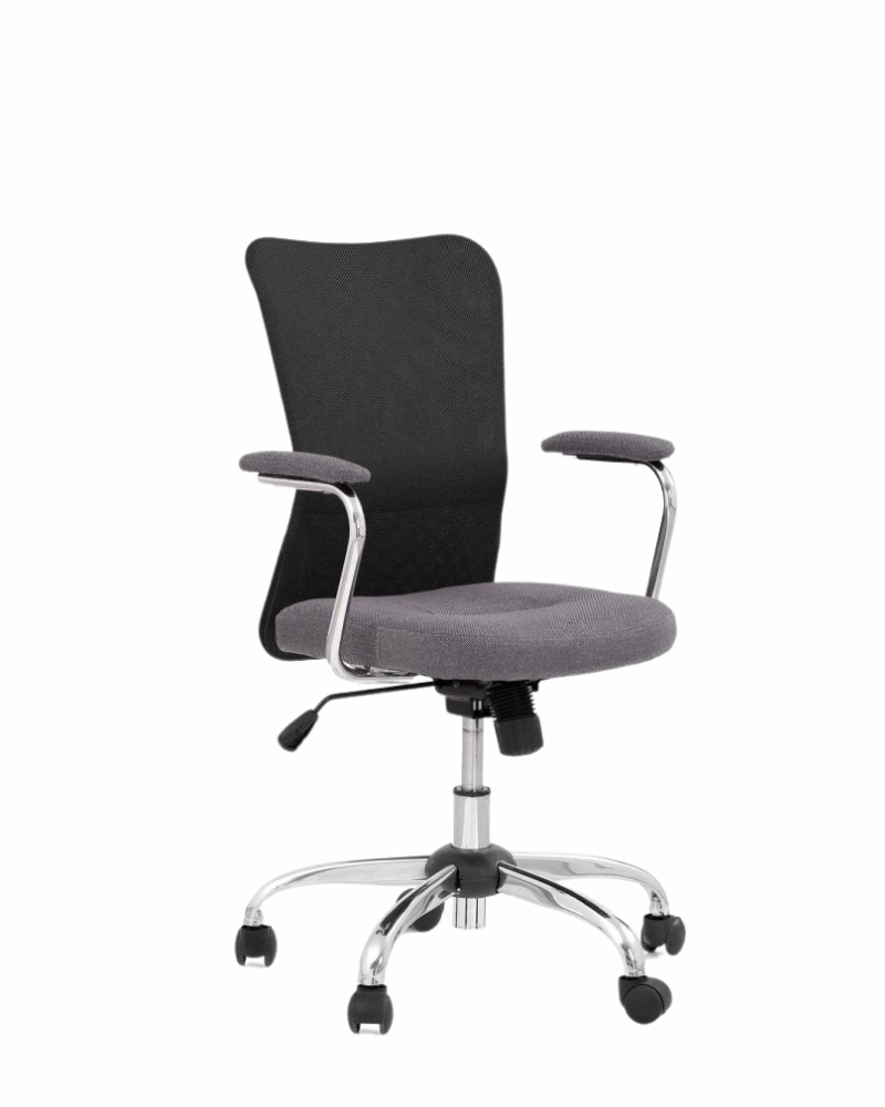 Сетчатая спинка, подлокотники с мягкими накладками и хромированная металлическая крестовина.