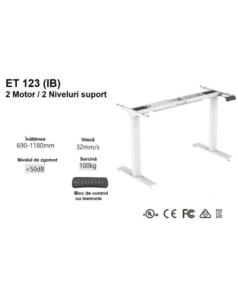 Усиленная конструкция (двухступенчатая) с 2 моторами позволяет поднимать две ножки стола на высоту от 690 мм до 1180 мм и является очень тихой (менее 50 дБ) при подъеме и опускании стола.