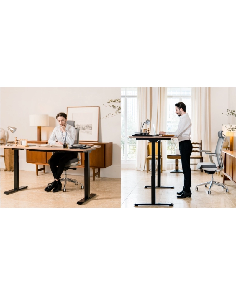 Усиленная конструкция(3-ступенчатая) двухмоторная конструкция позволяет поднимать две ножки стола в диапазоне от 580 мм до 1230мм и является очень тихой (менее 50 дБ) при подъеме и опускании стола.