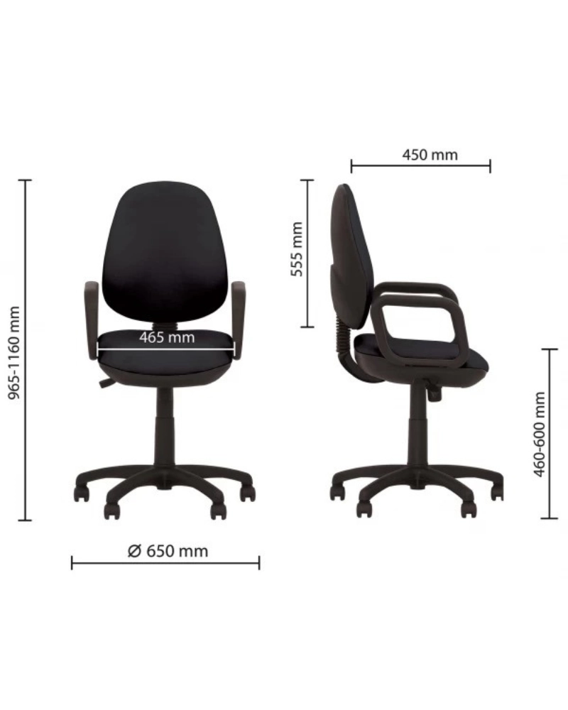 Модель оснащена механизмом «Перманент-контакт», который позволяет регулировать наклон, высоту спинки и глубину сидения кресла в соответствии с требованиями сидящего. База кресла выполнена из пластика и оснащена колесиками.