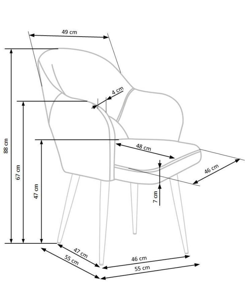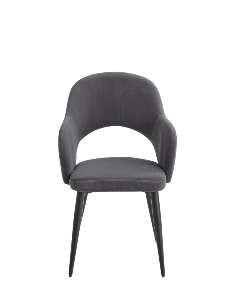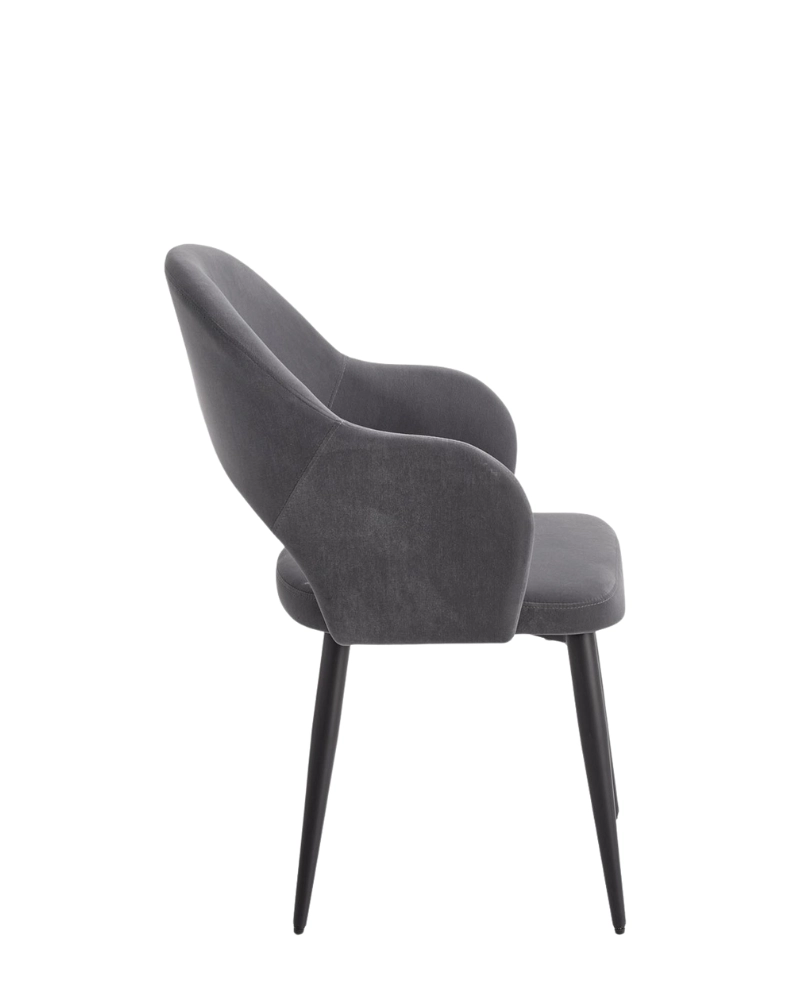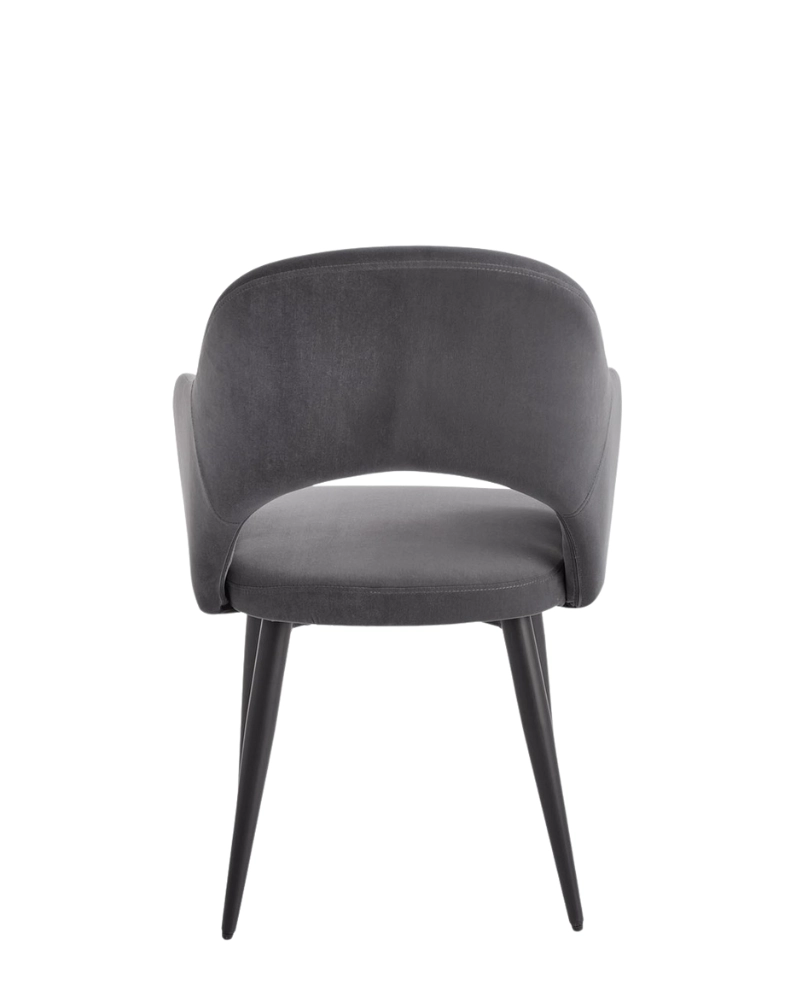 Сидение и спинка стула выполнены из бархатной ткани. Каркас из окрашенной в черный цвет стали.